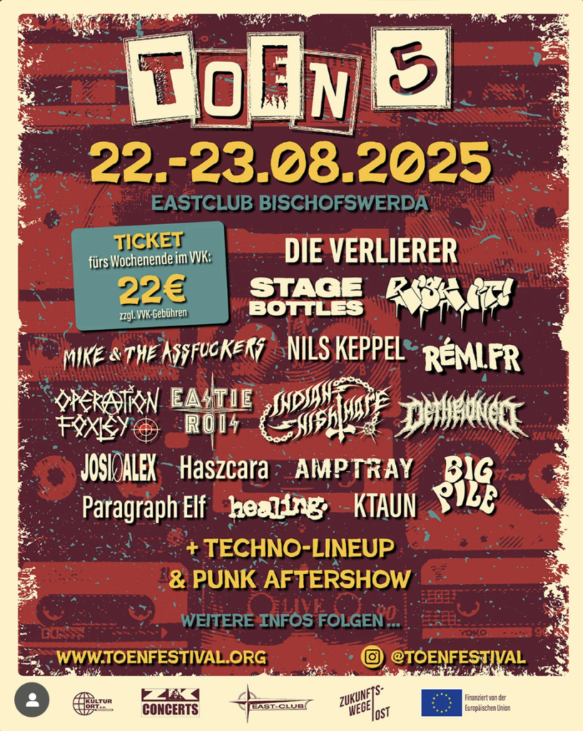 Der KulturOrt e.V. war in 2024 erstmalig Schirmherr des von unserem Nachwuchs organisierten TOEN-IV-Festivals auf unserem Gelände sowie im benachbarten EASTCLUB in Bischofswerda.